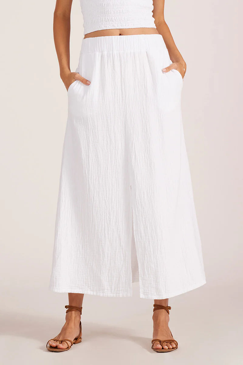 Spring ready in this cotton-gauze style skirt. In a maxi length with split front, this ultra-flattering silhouette is easy to style. Wear as a beach cover up, as a set, or with your favorite tank.