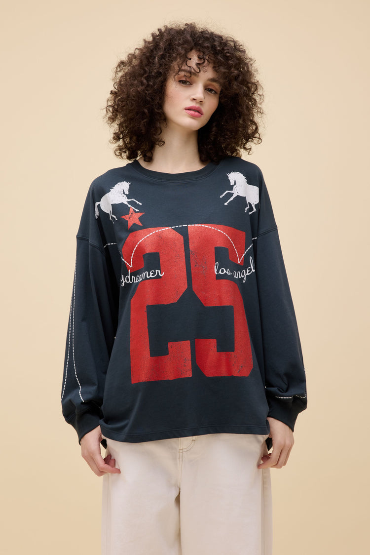 An addition for your country lineup, western motifs hit this oversized long sleeve designed with block numbers and a mention of Daydreamer Los Angeles.