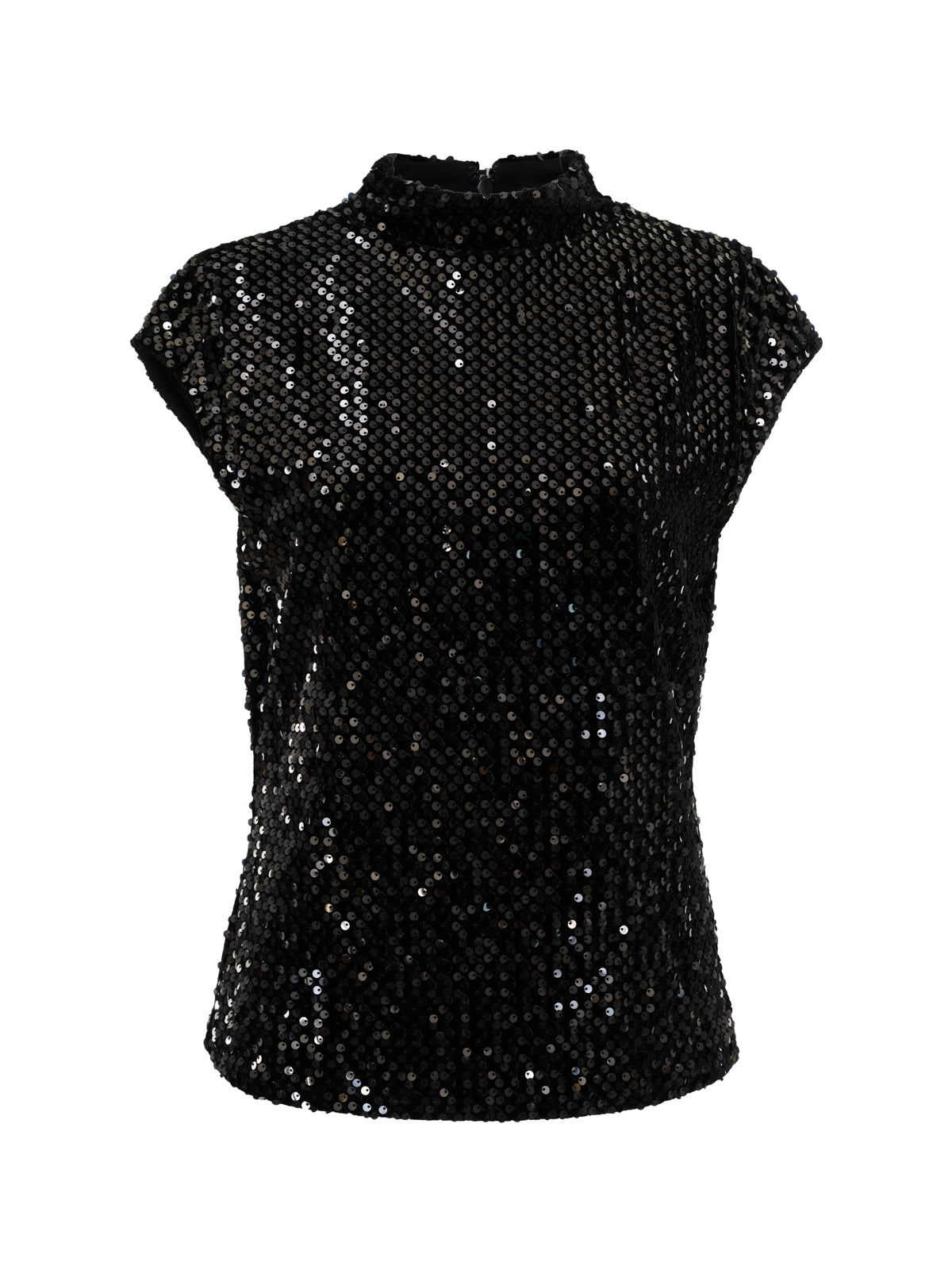 Shimmer meets simplicity in this elegant black sequin top. Designed with a soft, unstructured shape, it features a flattering fitted silhouette that gently contours the body without feeling rigid. The subtle funnel neckline and cap sleeves add a refined finish, while the all-over sequins deliver instant evening glamour. An invisible back zipper keeps the look clean and minimal.