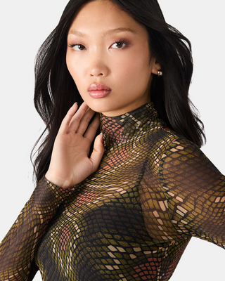 The VIVIENNE dress features a lined midi length sheer mesh outer layer finished with a mock neck and thumbhole sleeves.