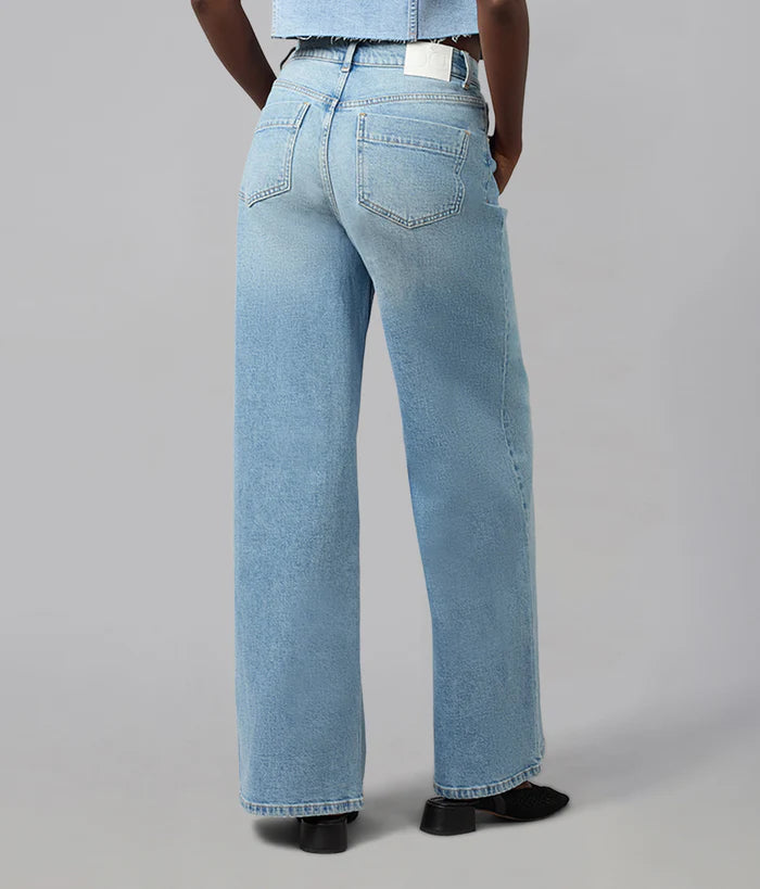 Playful yet polished, the MILAN Ultra High Rise Wide Leg Jean in Studded Whimsy Blue pairs bright color with a bold cut.