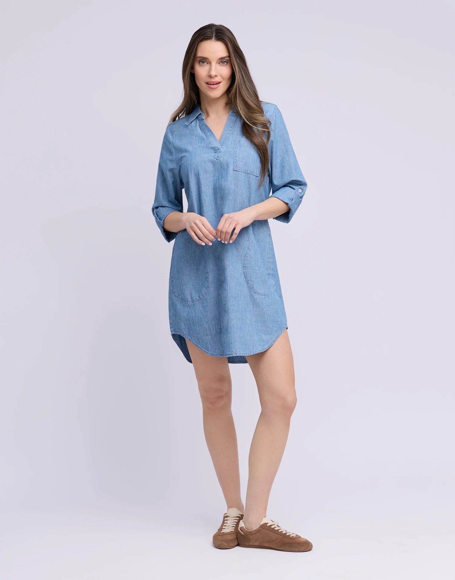 Introducing our 36" long Ava Dress, a modern take on effortless chic. Crafted in a light blue, this soft, 100% chambray cotton dress is fitted at the shoulders and straight through to the hips, then gently flares for a relaxed, flattering fit that moves with you. Ava strikes the perfect balance between easygoing comfort and polished style, making it a versatile addition to any wardrobe.