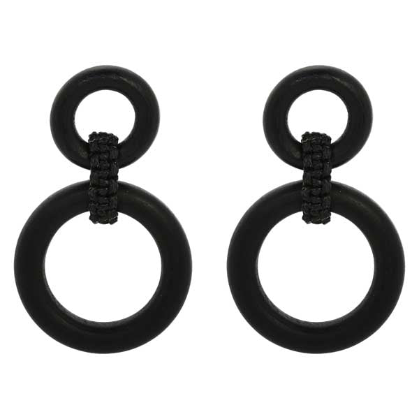 These black earrings feature a double-ring design with a central knotted detail, creating a modern yet timeless silhouette.