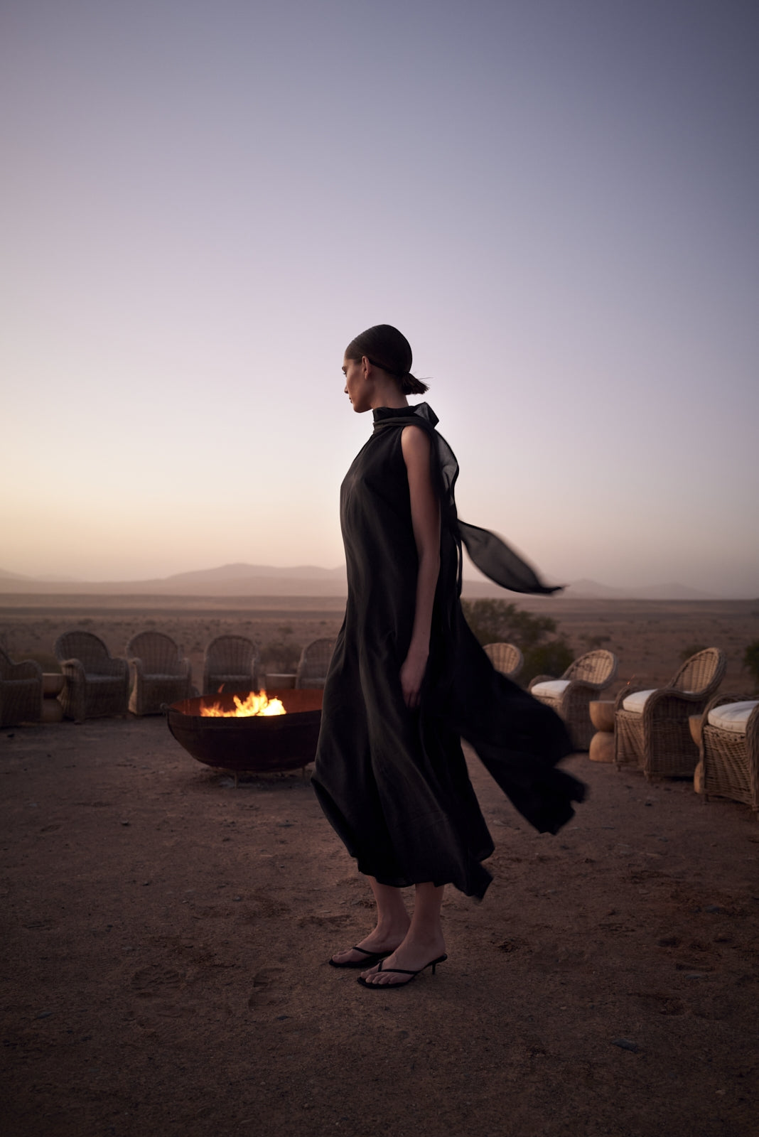The semi-sheer layered silhouette creates dimension and movement, while a flattering V neckline features a detachable tie funnel neck scarf for versatile styling. Practical side seam pockets and a subtle side slit enhance both comfort and sophistication. Perfect for evening occasions or refined everyday wear.