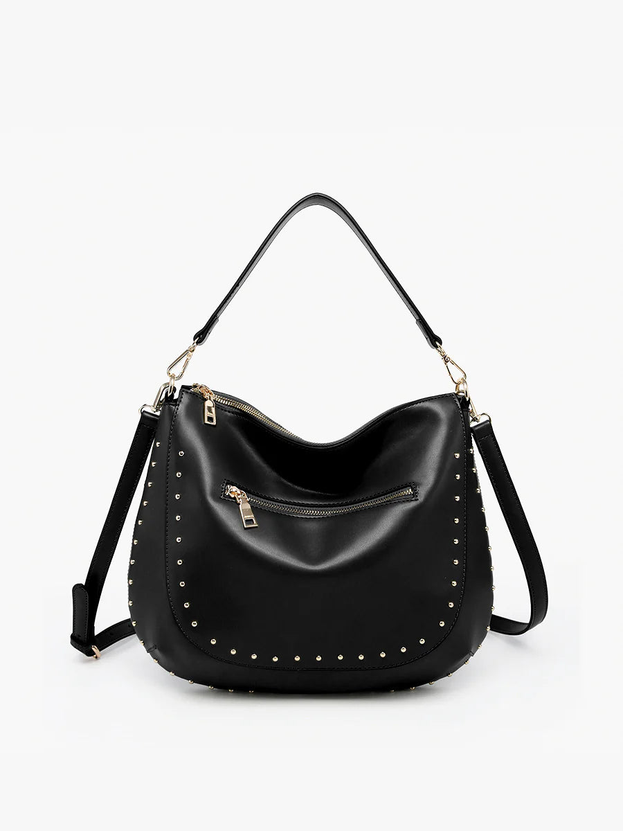 The Aurelia Studded Hobo combines edgy details with practicality, featuring studded accents and multiple storage options. With front and back zip pockets, a secure zip closure, and a detachable handle strap, this hobo offers both style and convenience. The adjustable, removable crossbody strap adds versatility for any occasion.