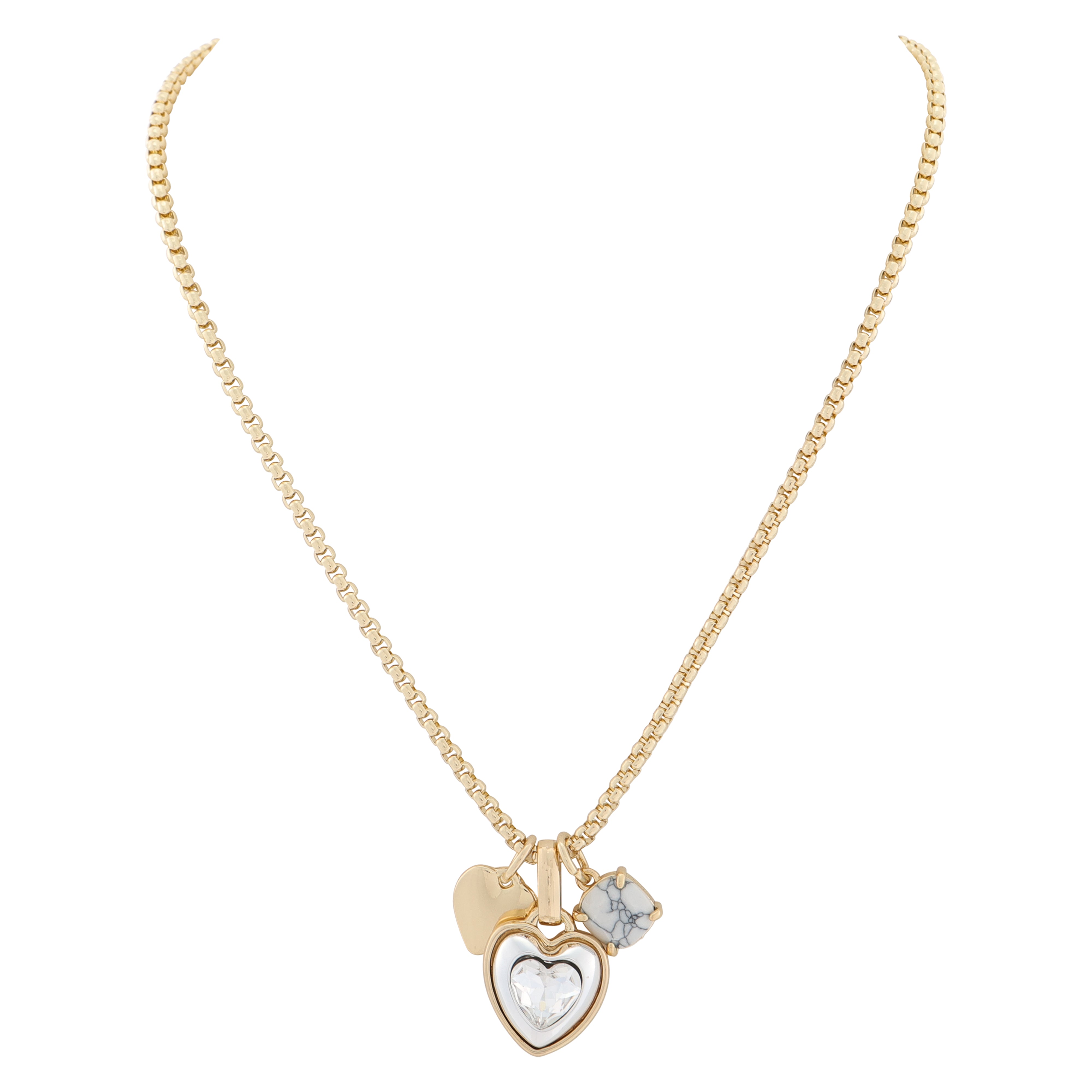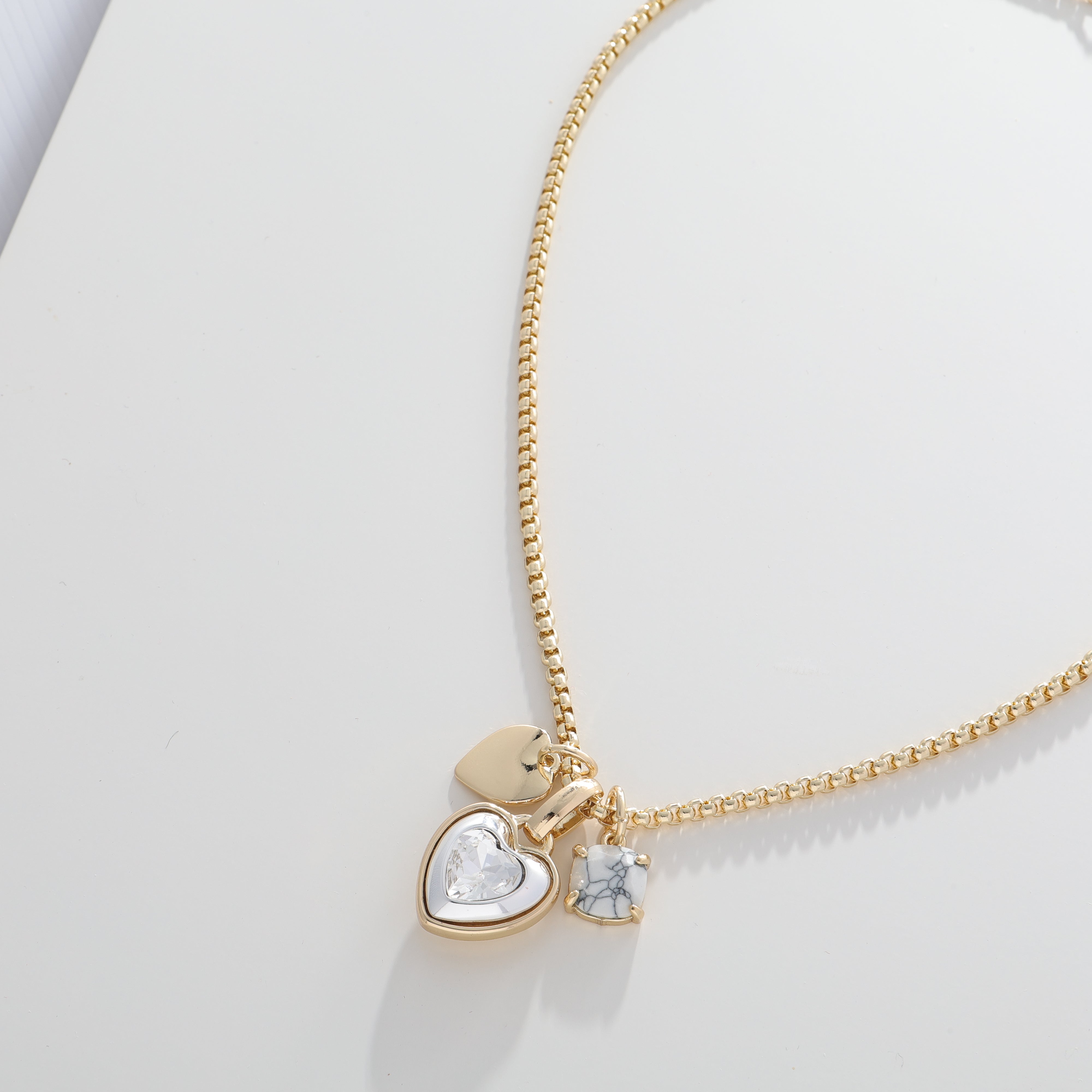 A delicate flat gold heart with a serene white marble-look stone charm, all anchored by a stunning statement gold bevel-set white crystal heart. Each piece shines with warm gold accents, creating a versatile cluster that works solo or mixed with your favorite chains. Perfect for gifting or treating yourself to a little heart-filled magic.