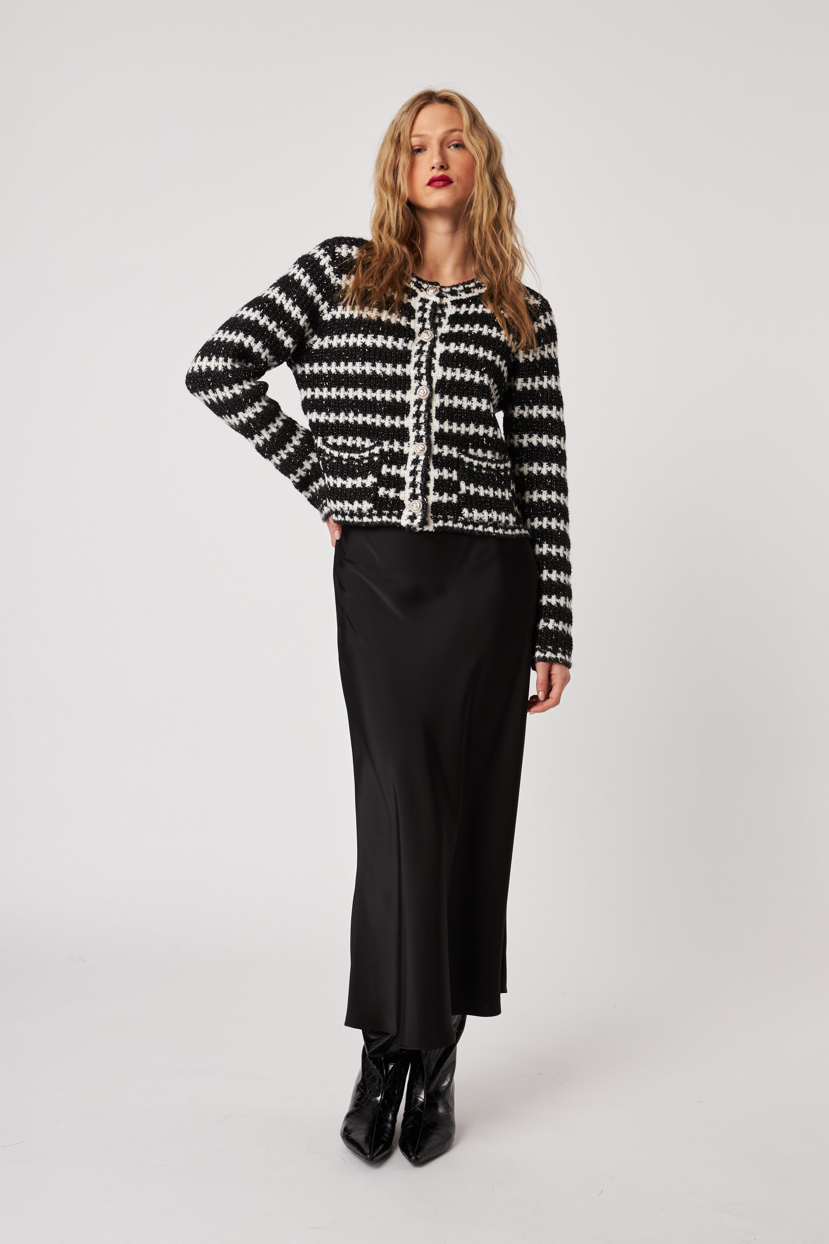Elevate your wardrobe with the Henri Button Up Cardigan, featuring classic black and white horizontal stripes for a timeless Parisian chic vibe. Designed with practical patch pockets and elegant silver buttons, this cardigan offers refined style and effortless sophistication perfect for any occasion.