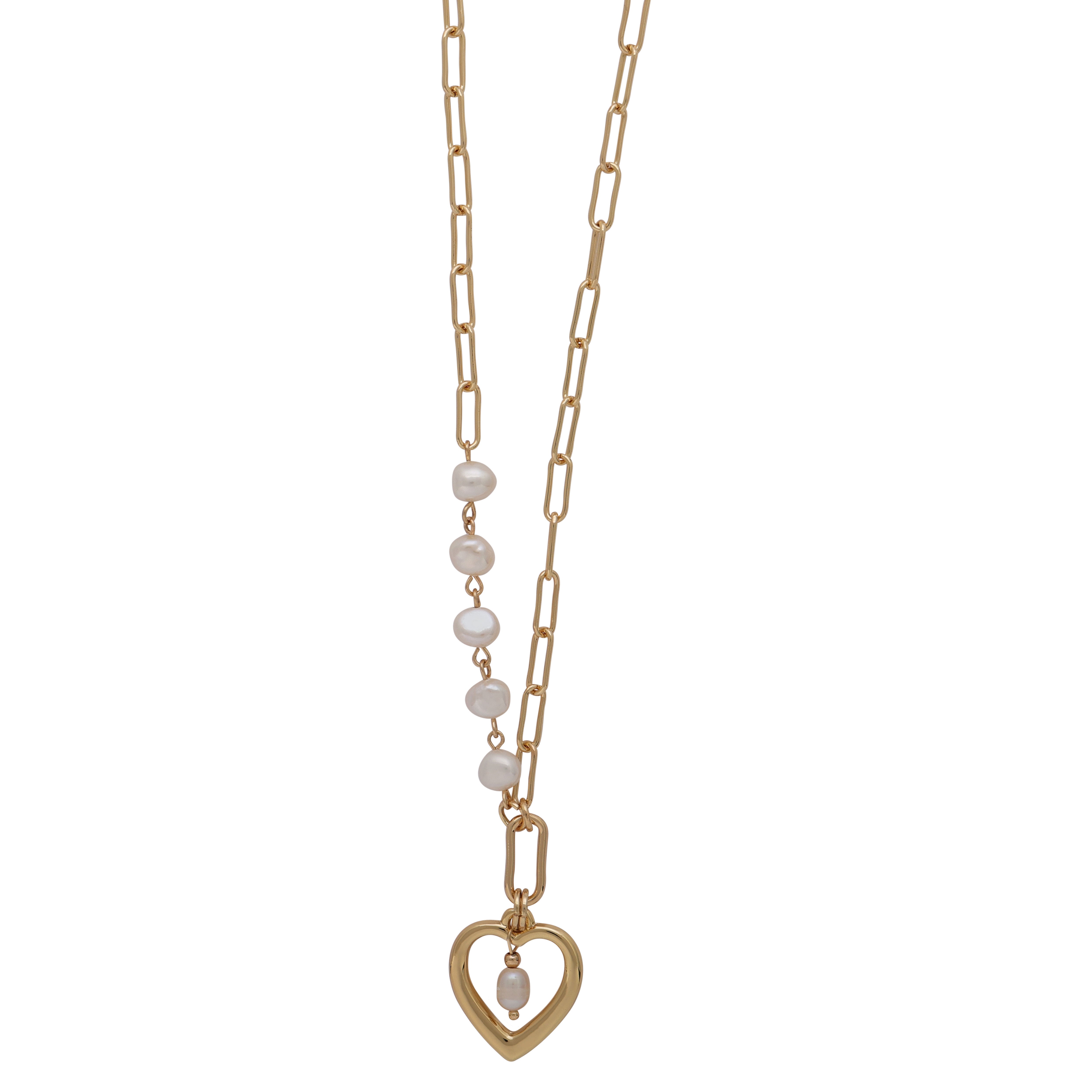 This playful design features an open gold heart charm paired with a dangling pearl. Mix textures and meanings—the heart symbolizes love, while the pearls adds a touch of sophistication.