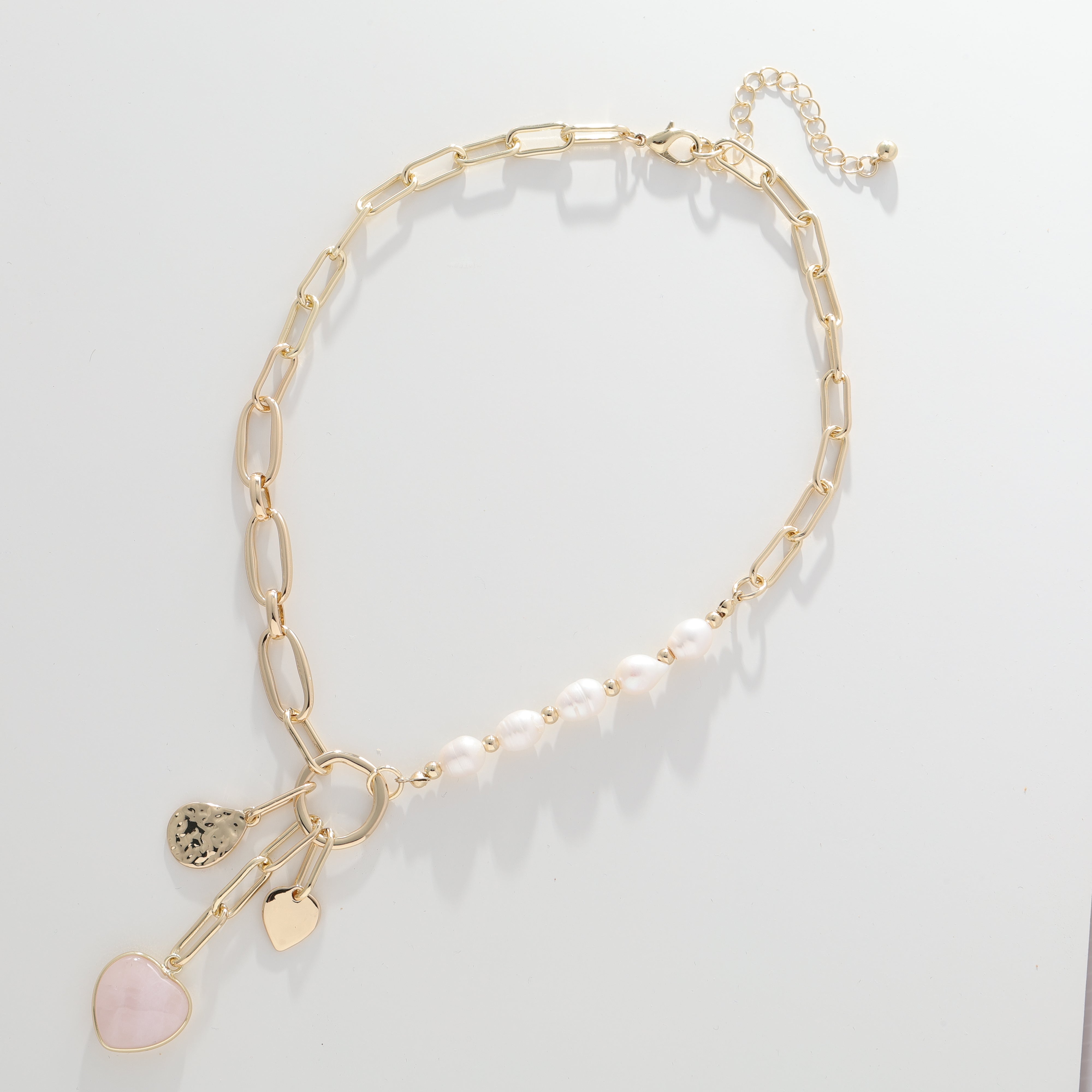 Julietta features three charming pendants suspended from a graduated paperclip chain that gets bolder as it descends, creating an eye-catching effect. Delicate bead accents add texture and movement, while the adjustable extender ensures the perfect fit every time. Versatile enough for everyday wear yet striking enough to elevate any outfit.