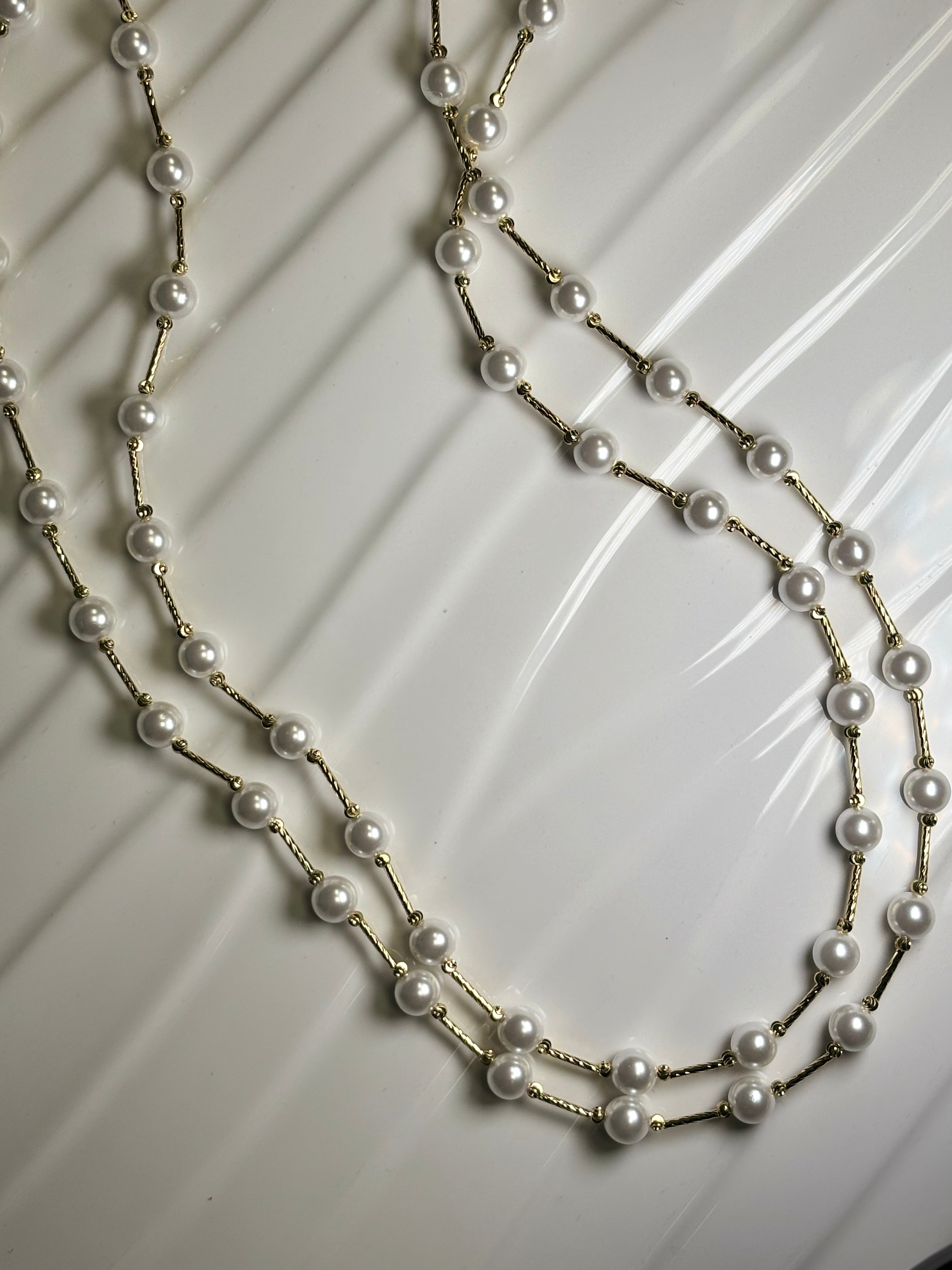 Elevate your style with the Arabella Necklace, featuring lustrous pearls delicately paired with elegant gold accents. Its long design adds a graceful, sophisticated touch, perfect for layering or wearing solo to enhance any outfit with timeless charm.
