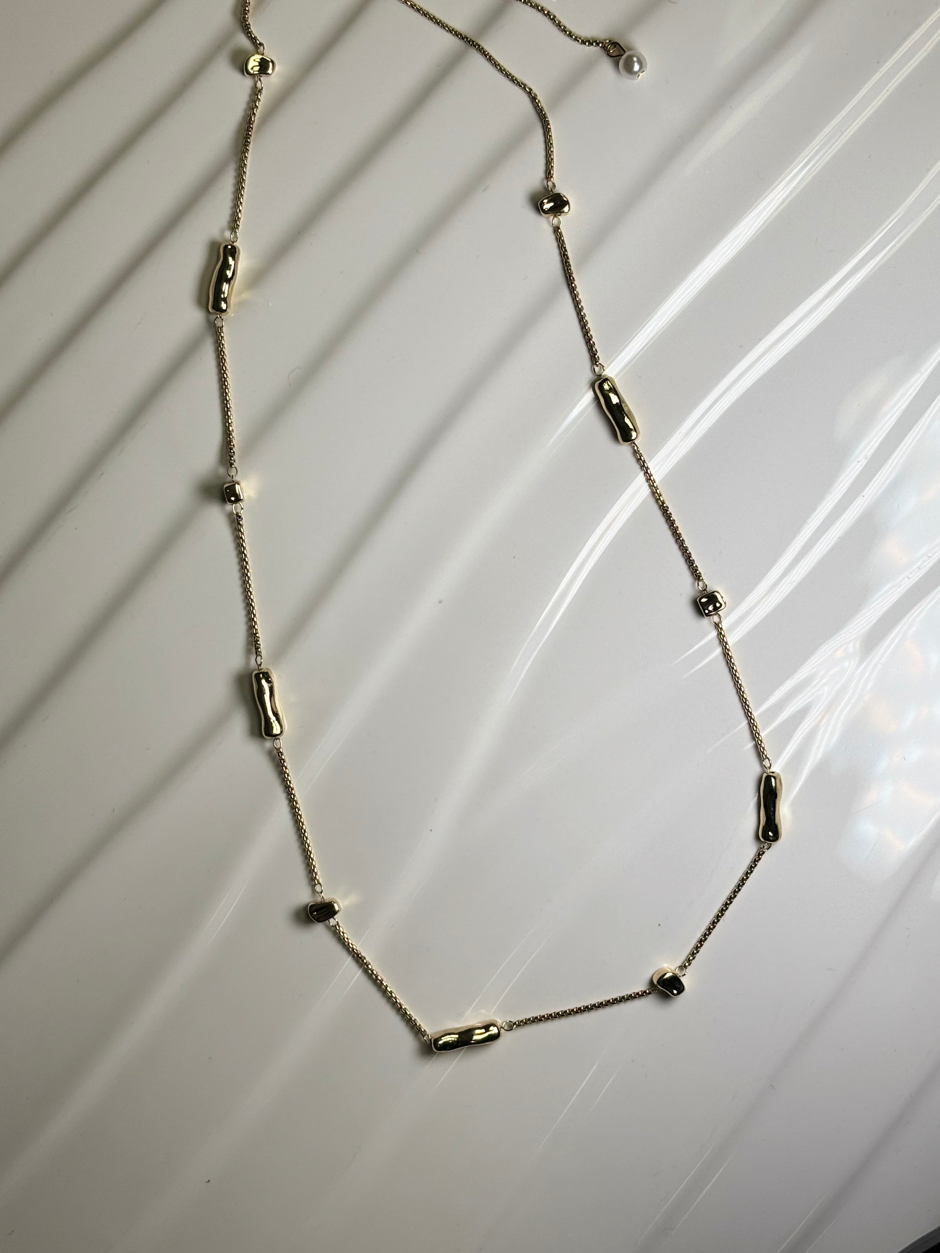 Elevate your look with the Avonlea Necklace, featuring an elegant gold chain accented by a delicate arrangement of long and short gold beads. This piece adds a refined touch to any outfit, blending subtle texture with timeless shine for a sophisticated statement. Perfect for layering or wearing alone, it enhances your style with effortless grace.