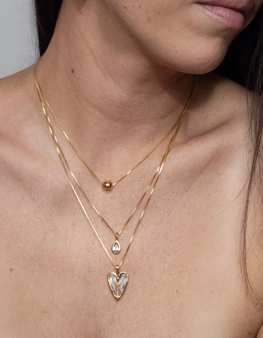 After sketching many, many hearts in a note book at a coffee shop, the Monroe heart necklace came to life! Sarah was imagining what a modern day Marilyn Monroe might wear as a heart, and we love the contemporary twist on this classic shape. The faceted cubic zirconia adds the perfect amount of sparkle, and the box chain offers two lengths in one chain with a little link at 18" that extends the chain to 20".