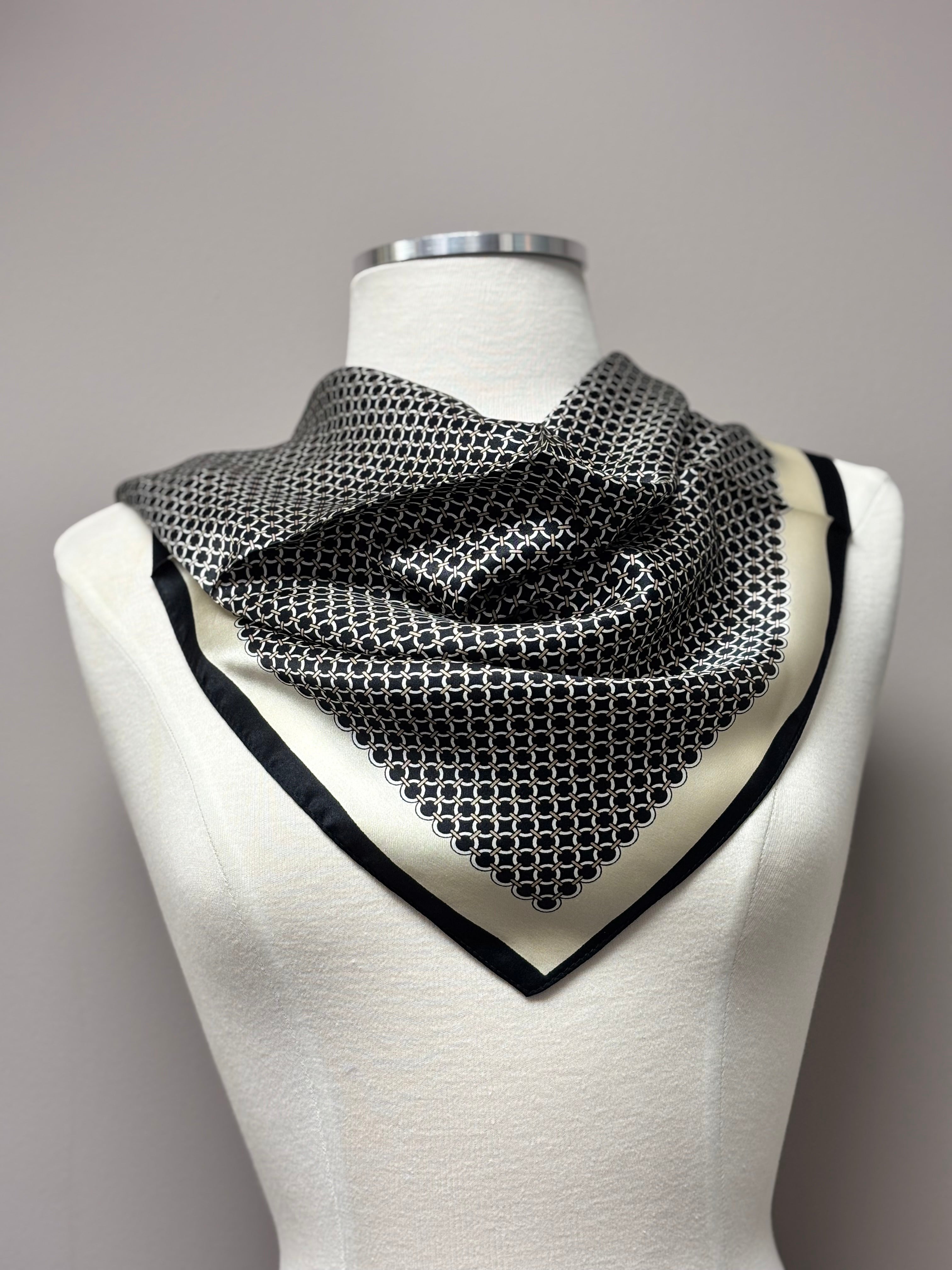 Elevate your ensemble with the Evie 100% Silk Scarf, featuring a refined circular grid geometric pattern framed by a striking black and cream contrast border.