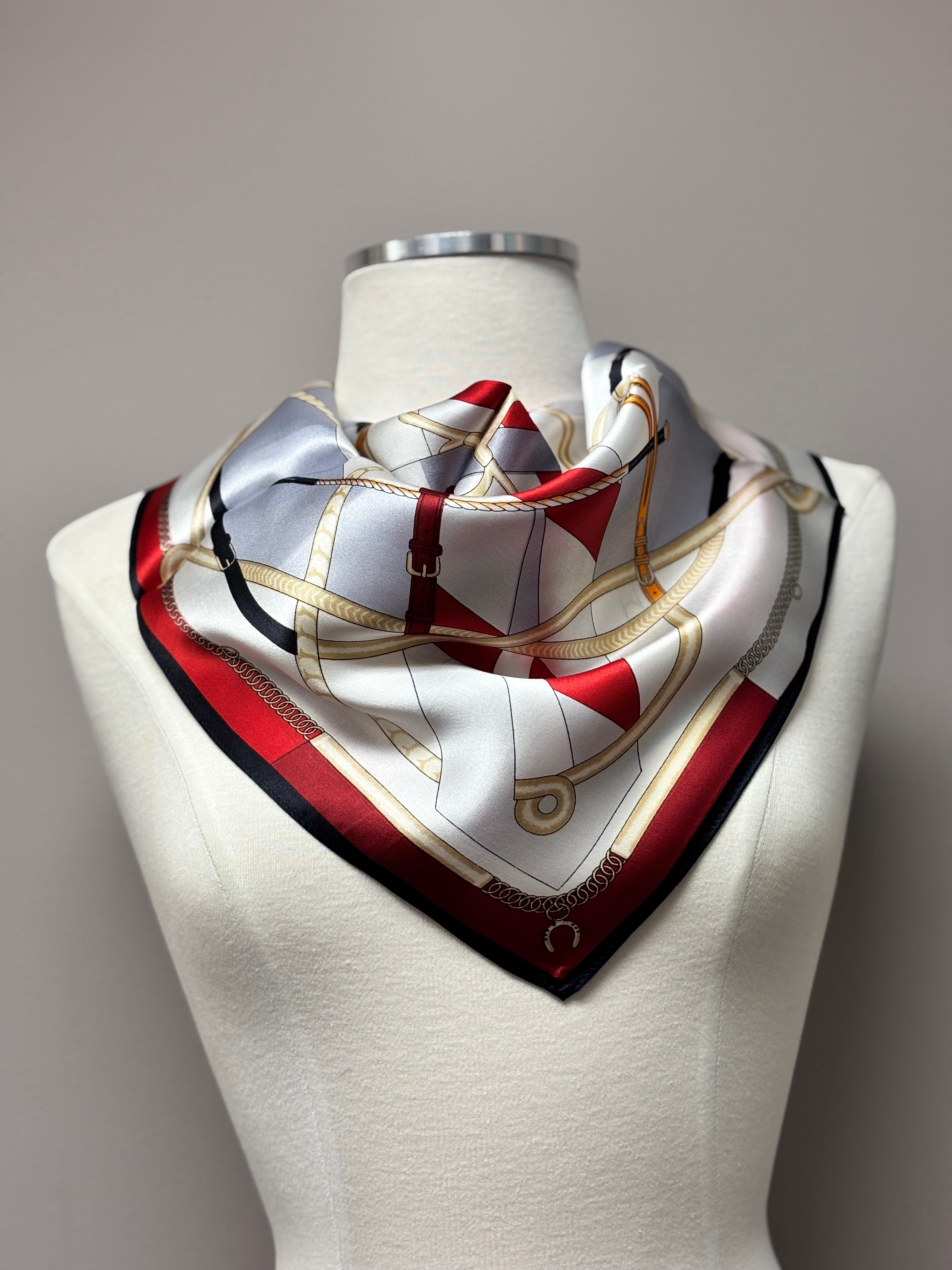 The Millie 100% Silk Scarf showcases an elegant abstract pattern of intertwined looping belts, bordered by a classic chain design. Featuring a refined palette of soft blue, cream, beige, ivory, black, vibrant red, and deep maroon, this scarf offers a rich and sophisticated accent to any wardrobe.