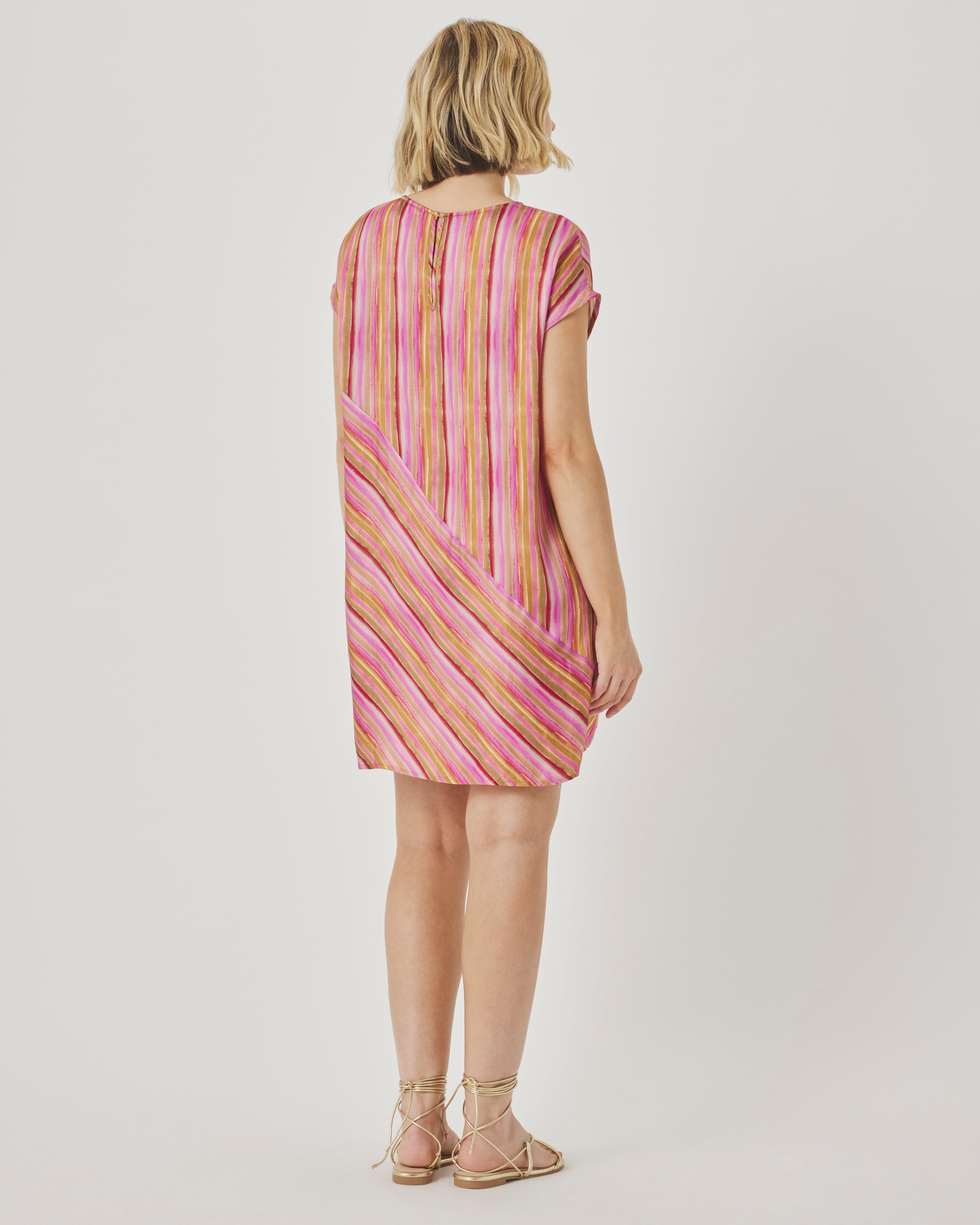 A little bold, a lot of fun. This mini shift dress has a relaxed A-line fit with cap sleeves and a watercolor stripe print.