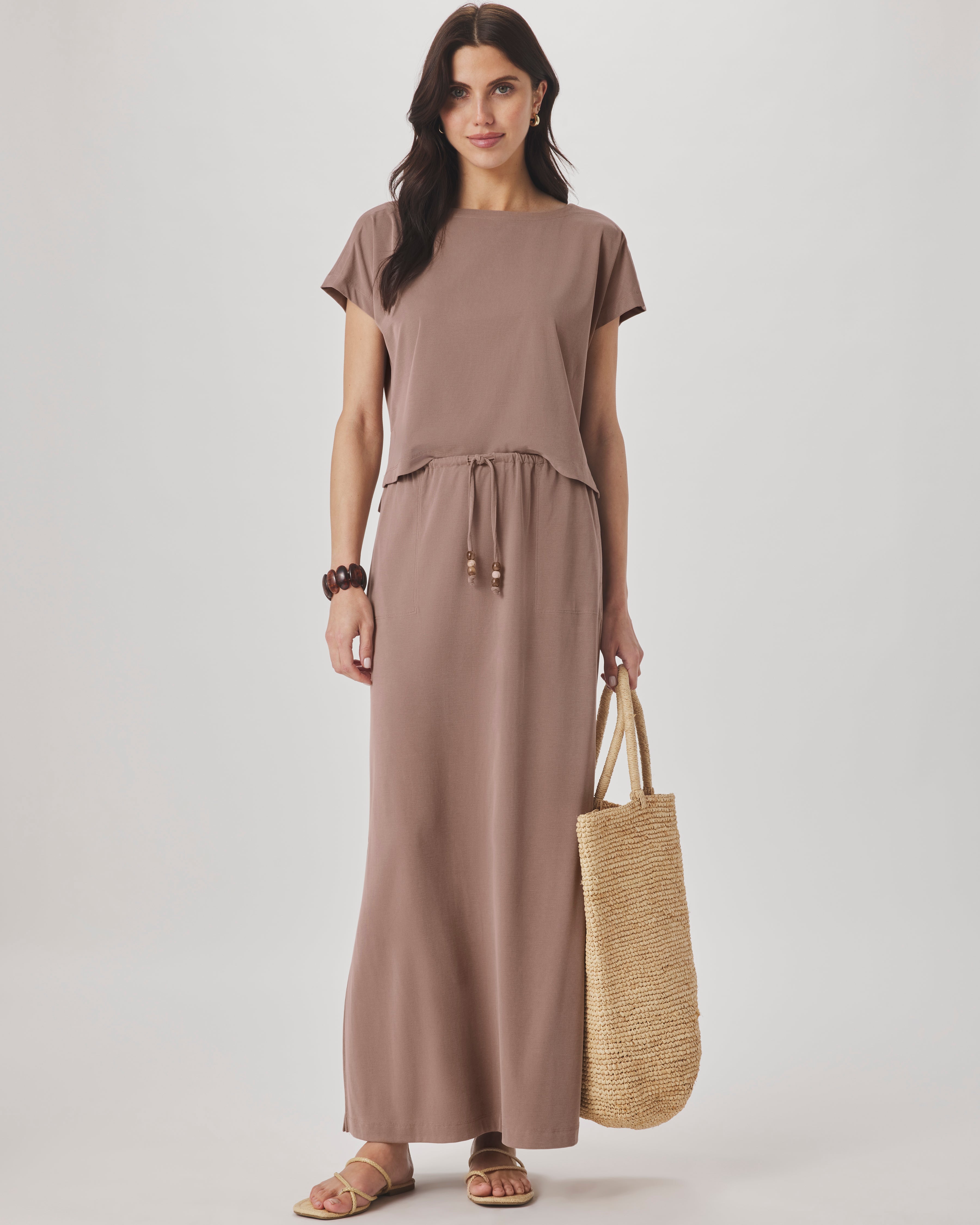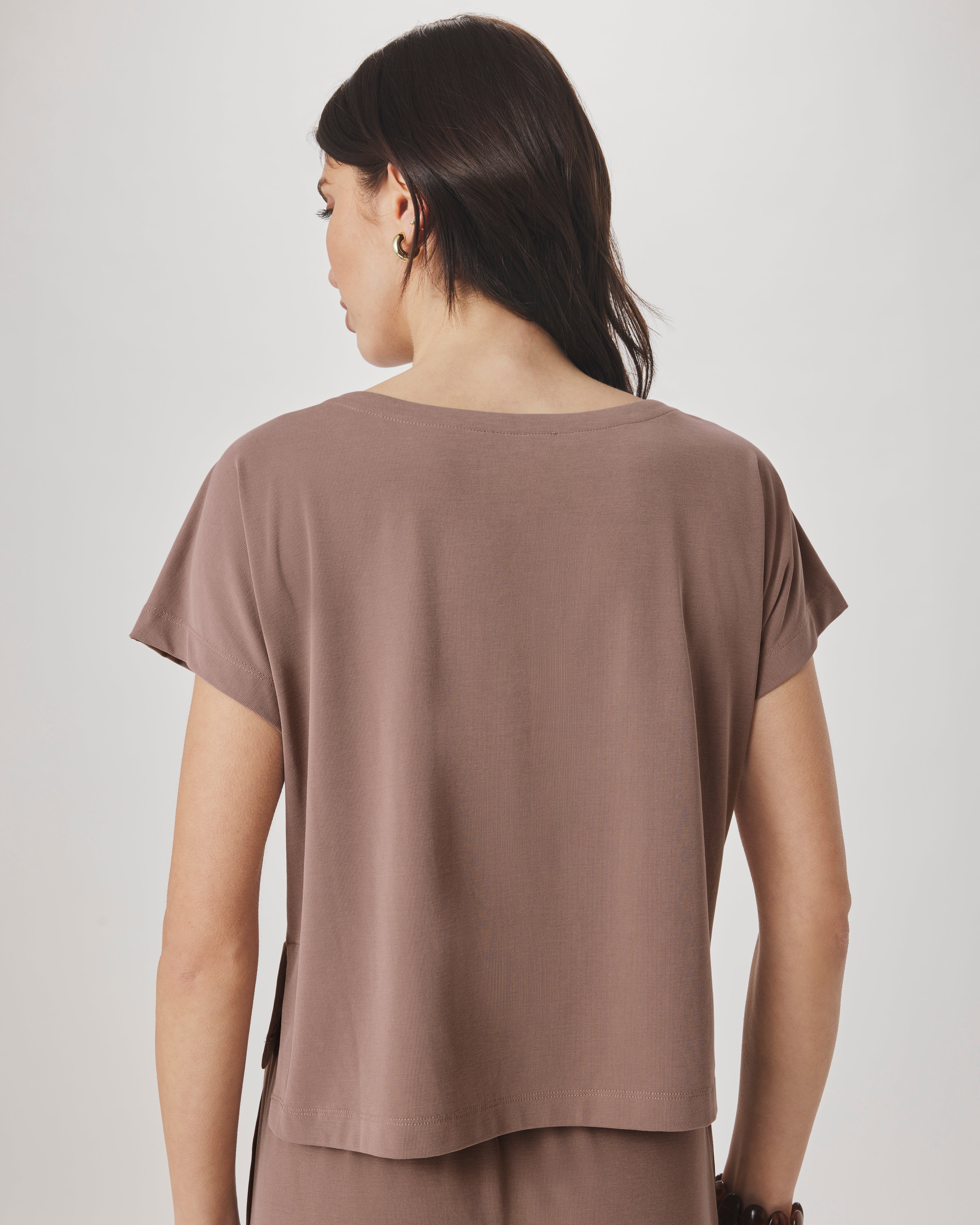 Crafted from a breathable modal and polyester blend, this short-sleeve essential features a relaxed round neckline and flattering split side hem for added movement and style. Perfect layered or worn solo, it's a versatile wardrobe staple that transitions seamlessly from day to night.