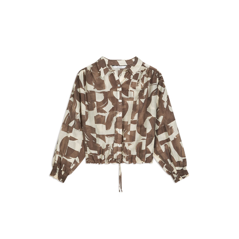 Blouse in slightly transparent fabric with a graphic print. This item has a boxy fit, with the drawstring hem and elastic on the back creating a subtle flowing effect. The blouse features mother-of-pearl buttons, lowered shoulders with gathers at the panel and smocked sleeve cuffs.