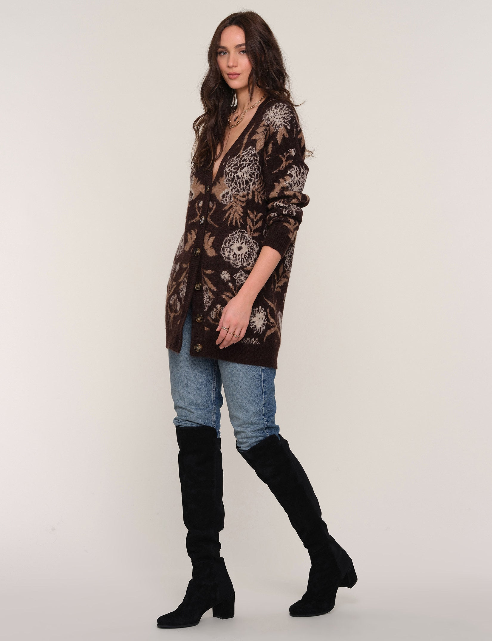 The Ryan Cardi is a long-line fit knit. It features an all-over jacquard pattern, with a solid rib trim. We love it worn over a plain white tee with jeans.