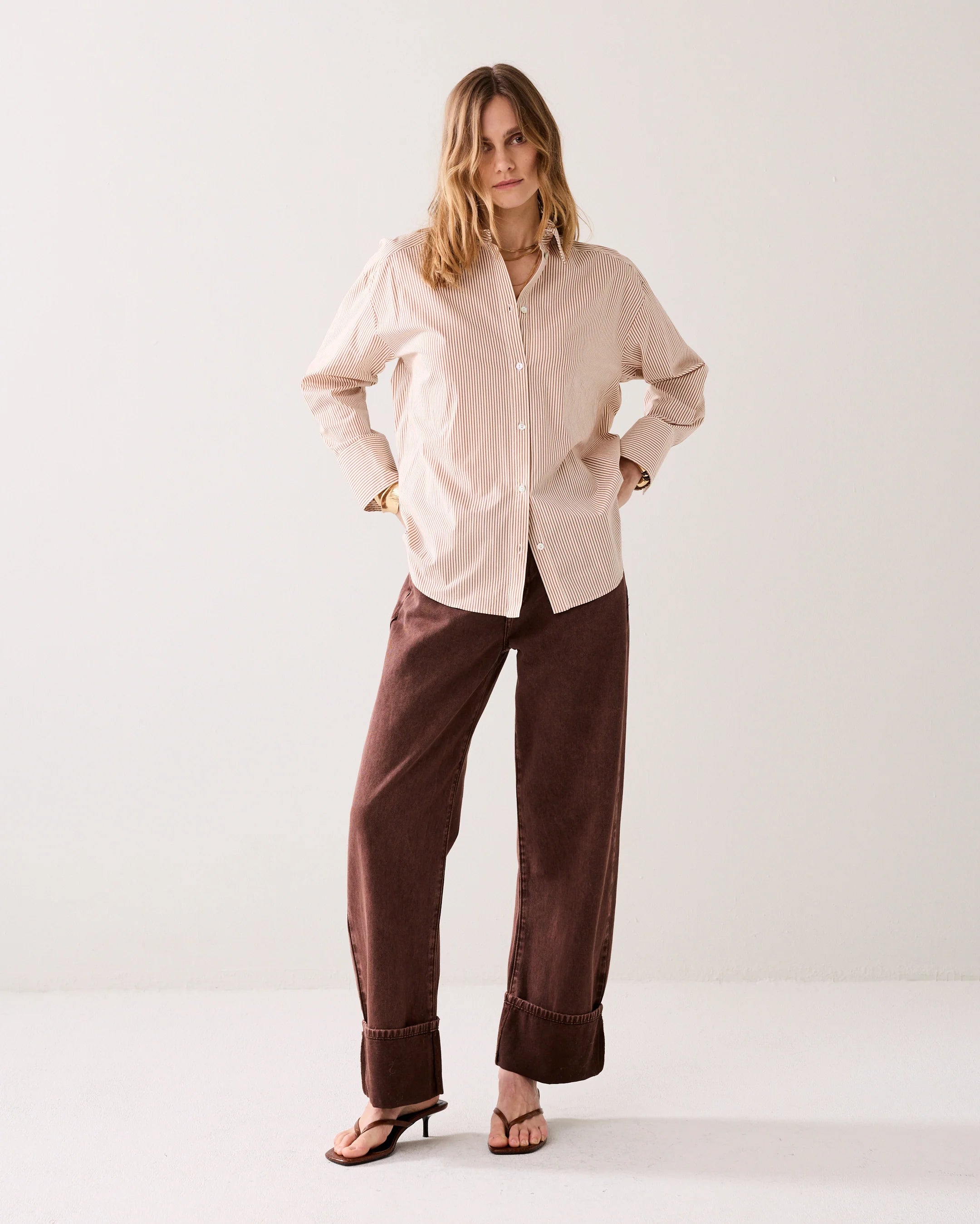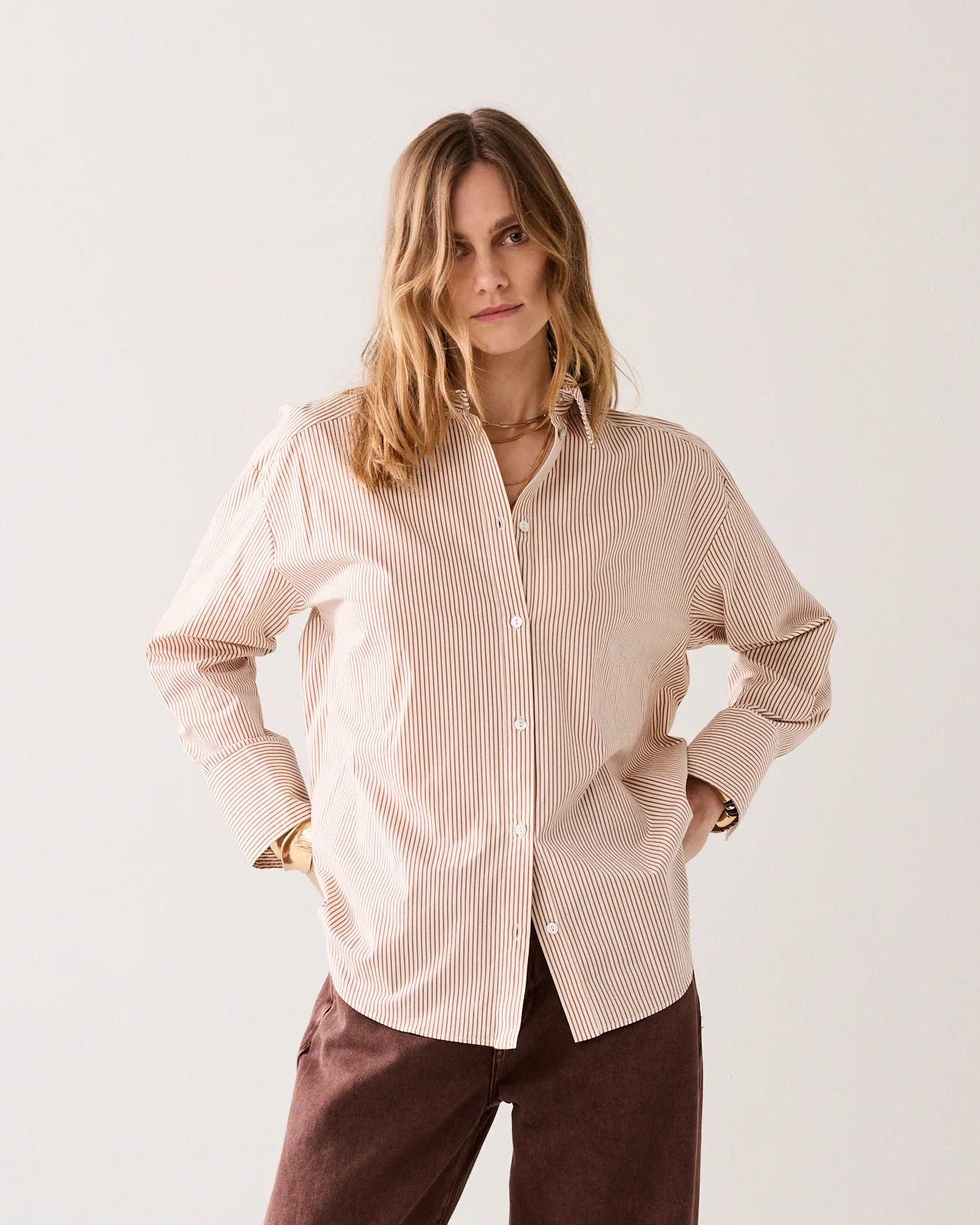 Loose-fitting shirt blouse in a fabric blend: a printed viscose and a striped cotton fabric. The blouse has a lowered shoulder seam and adjustable cuffs.