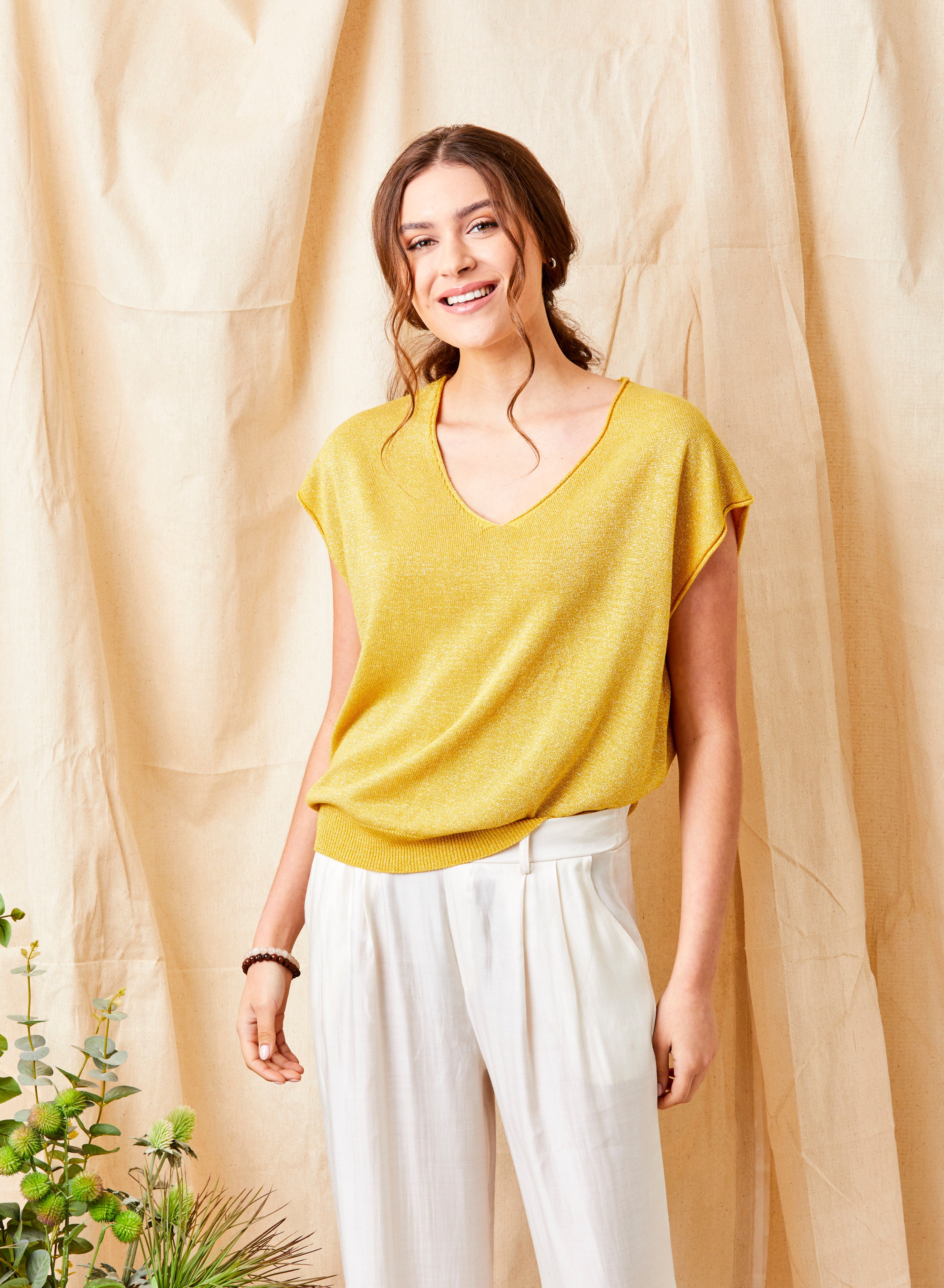 Meet the Faline V Neck Sparkle Sleeveless Knit—your new go-to for adding a dash of shimmer to any outfit. This playful sleeveless knit features a chic V neckline and eye-catching sparkle details that bring just the right amount of glam without trying too hard. Soft, comfortable, and endlessly versatile, it's perfect for layering over a crisp shirt or showing off on its own. Dress it up for a night out or keep it casual with your favourite jeans—either way, you'll be turning heads.