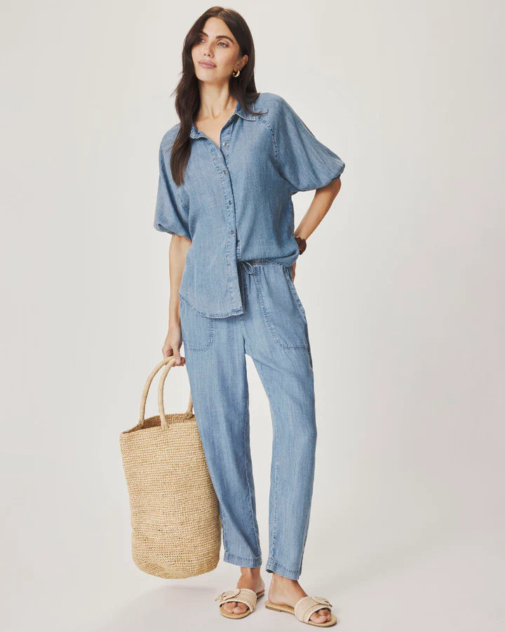 Meet your new sunny day uniform: Our classic chambray button-down with billowy puff sleeves and silver buttons.