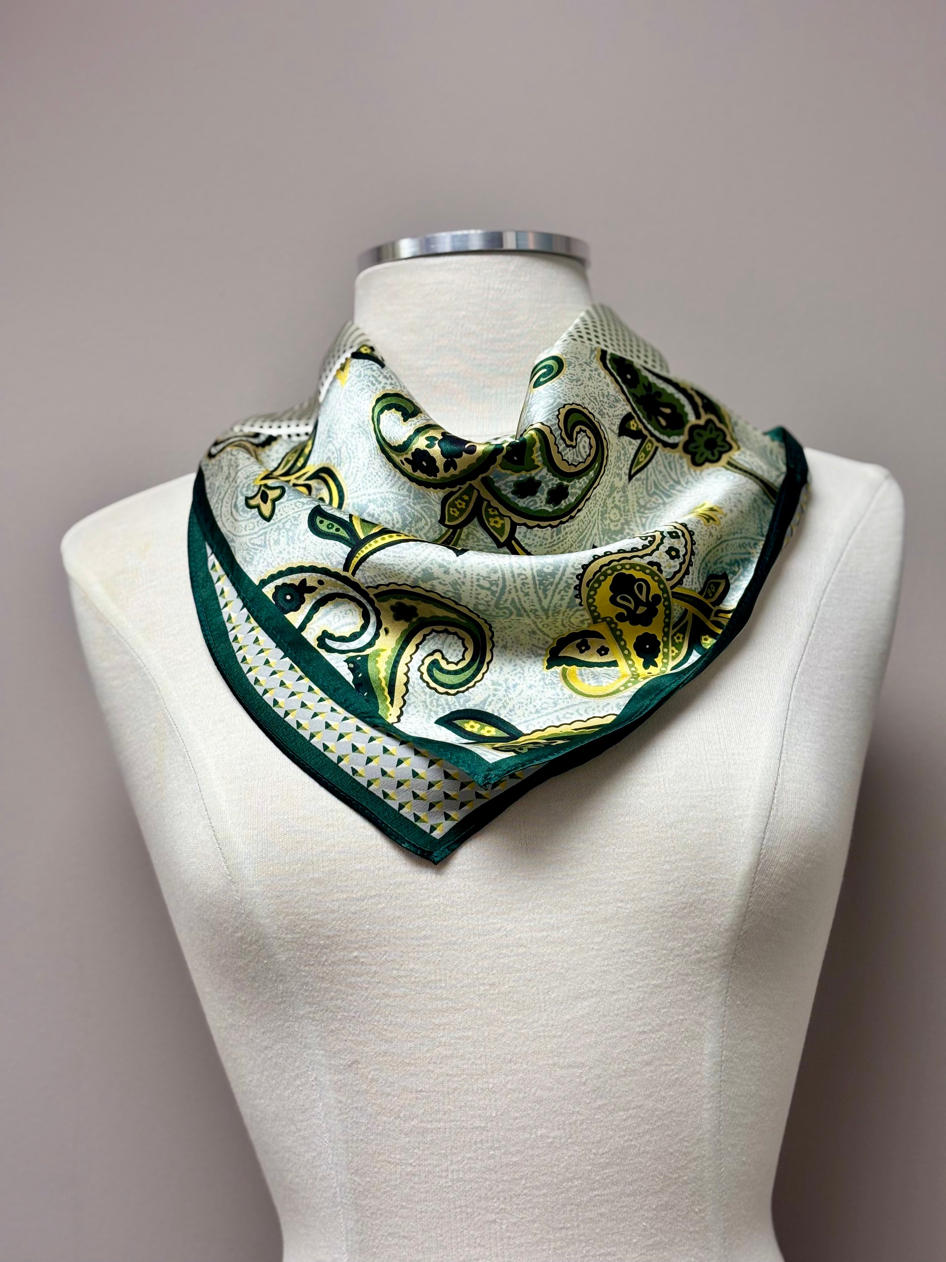 Elevate your ensemble with the Maya 100% Silk Neck Scarf, featuring an elegant fusion of paisley, checkered, and diamond patterns. This sophisticated accessory showcases a harmonious blend of deep green, mint green, mustard yellow, and sage hues, framed by a refined contrast border. Crafted from luxurious silk, it offers a smooth texture and graceful drape, perfect for adding a subtle yet distinctive touch to your wardrobe.