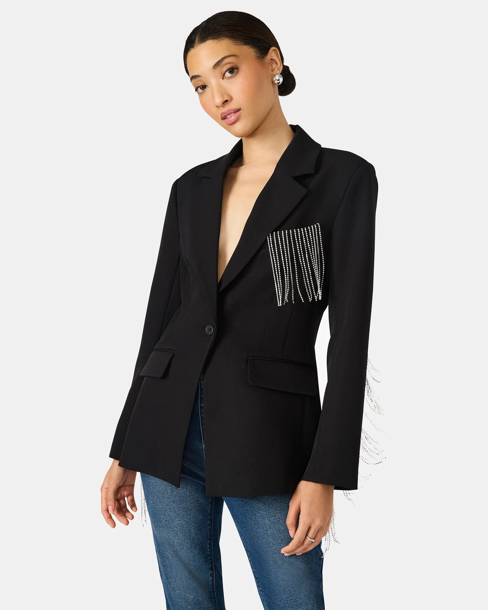 Elevate your wardrobe with this striking black blazer, where timeless tailoring meets contemporary glamour. Delicate sparkle tassel details cascade along the lapels and cuffs, adding an unexpected touch of sophistication and movement to every wear. Perfect for transitioning from boardroom to evening events, this piece effortlessly combines polished elegance with eye-catching embellishment. A versatile essential that transforms any outfit into something truly memorable.