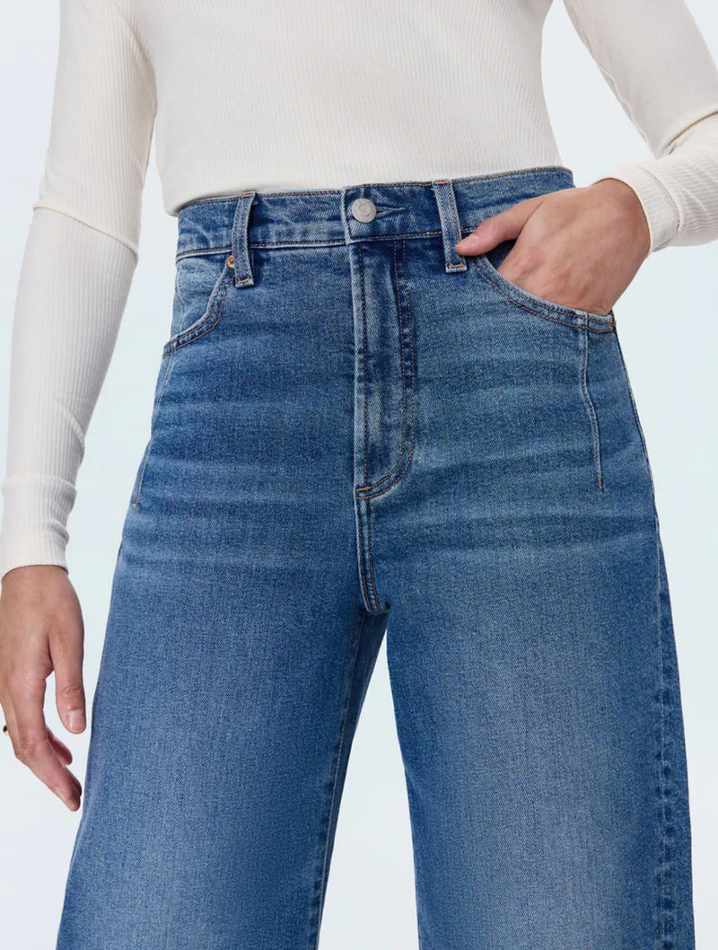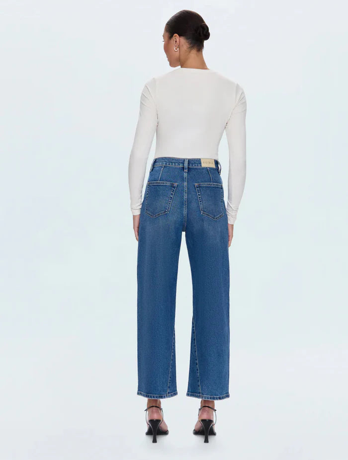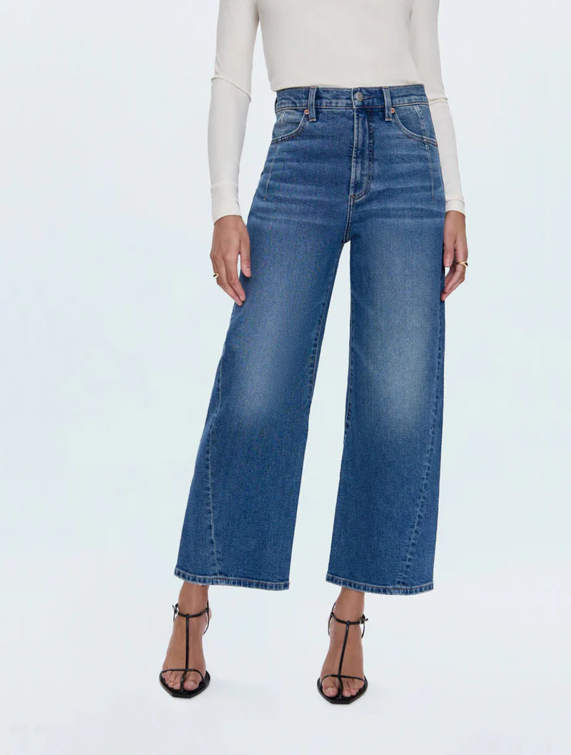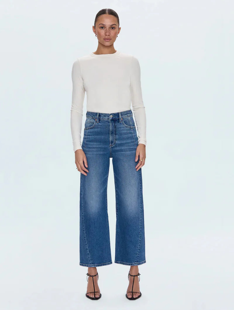 The new must-have jean with a twist. Kyra sits confidently at a high rise with our signature bowed leg silhouette and cropped 28" inseam. The subtle curve creates dimension while the wide ankle opening adds modern proportion with a new wide angle for the season. Fashion detail seaming, including a twisted seam that moves forward and yoke seams in the back, brings modern denim classic sophistication. Crafted from our signature comfort stretch denim in Soho, a medium vintage wash with subtle fading that feels both contemporary and timeless