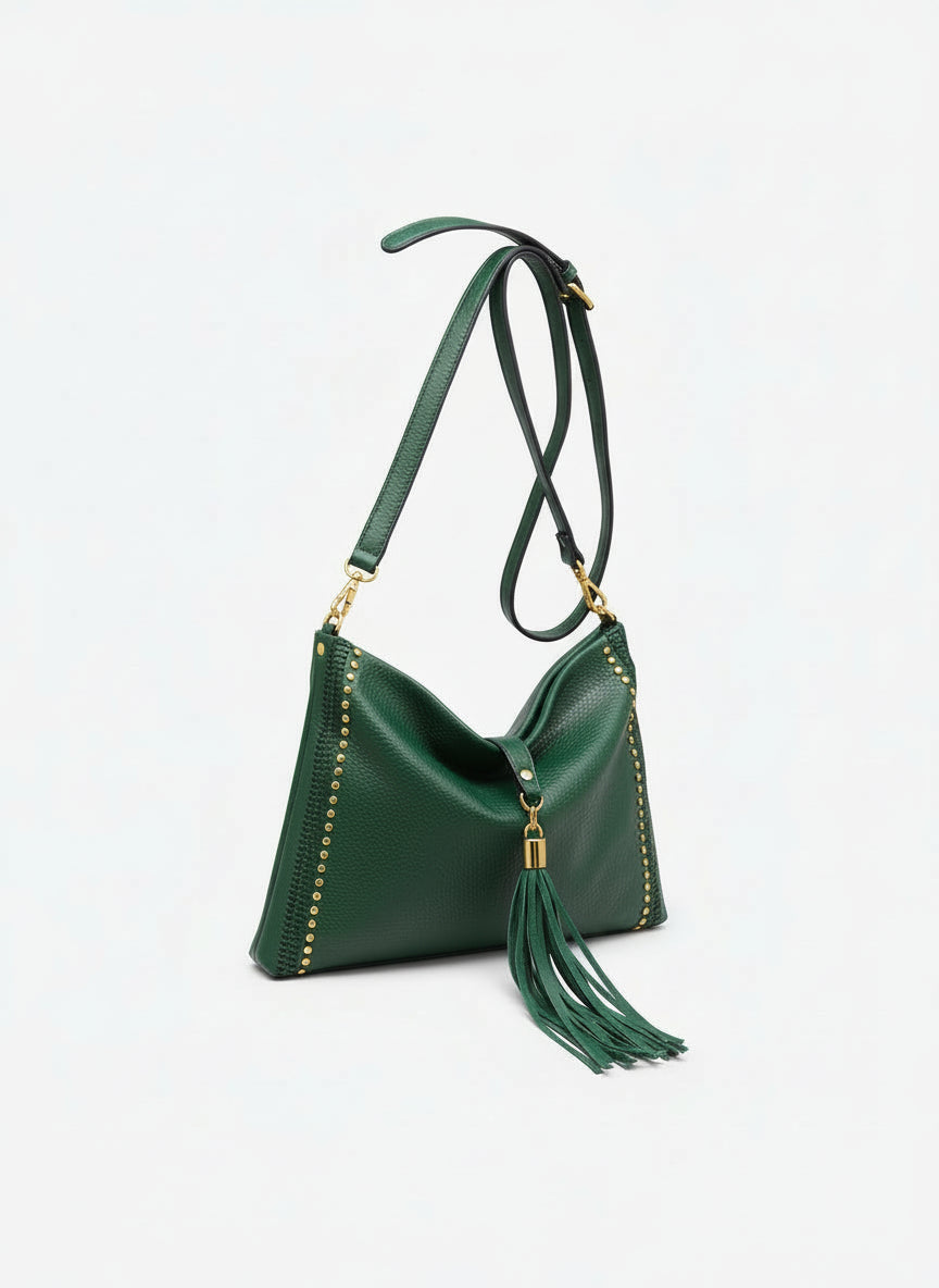 Discover our trendy style that combines fashion and functionality seamlessly. Adorned with a foldover long tassel and chic studded details, this bag exudes contemporary charm. The adjustable and detachable shoulder strap offers versatility in wear, allowing you to customize your look effortlessly. Inside, you'll find two open pockets and one zipper pocket, providing convenient storage for your essentials. Additionally, there's a back pocket for quick access to items. The bag zips closed securely, ensuring the safety of your belongings. With dimensions measuring 13"L x 9.5"H x 2.5"D, it's the perfect accessory for any occasion.